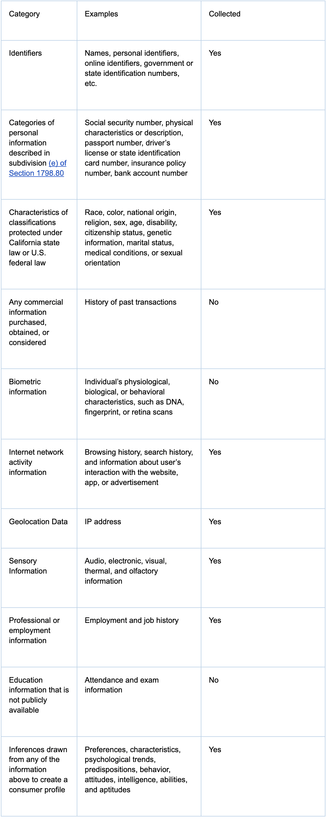 We have collected the following categories of personal information in the past twelve (12) months: